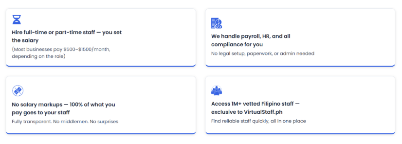 If you’re tired of overpriced agencies or the DIY stress of job boards, VirtualStaff.ph offers the middle ground: full control and affordability, with none of the legal or operational headaches.